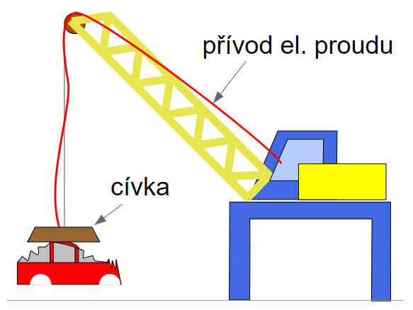 jeřáb na šrotišti: místo háku má elektromagnet, vypínač spíná jeřábník |