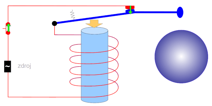 (animace): stisk tlačítka-> Průchod proudu kontaktem->Přitahování kladívka-->CINK+přerušení kontaktu-->Pružina vrátí kladívko+znovu sepnutí kontaktu (děj se opakuje mnohokrát za sekundu) |