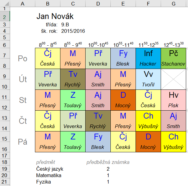 v listu "rozvrh" budou texty "M", "Aj"… odkazem do patřičných listů